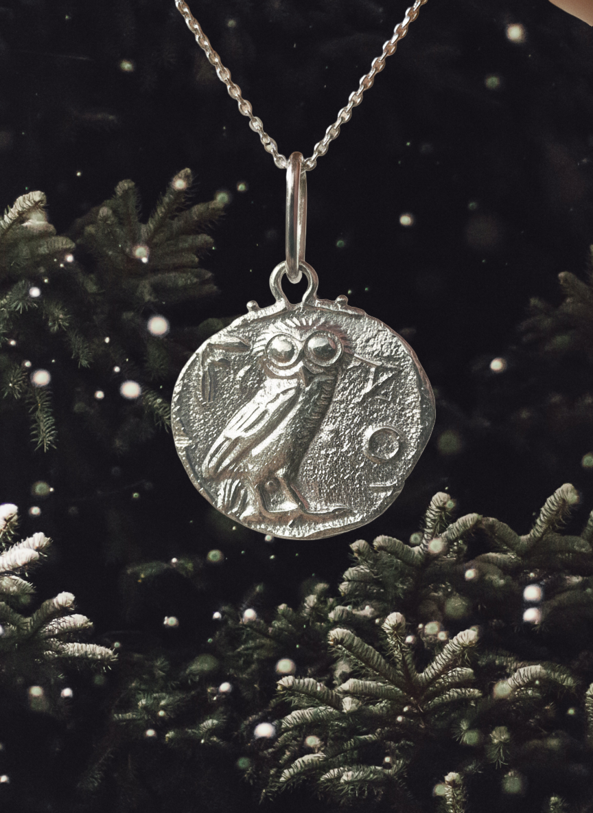 A timeless symbol of wisdom and strength. Inspired by ancient Greek coins and crafted in sterling silver.