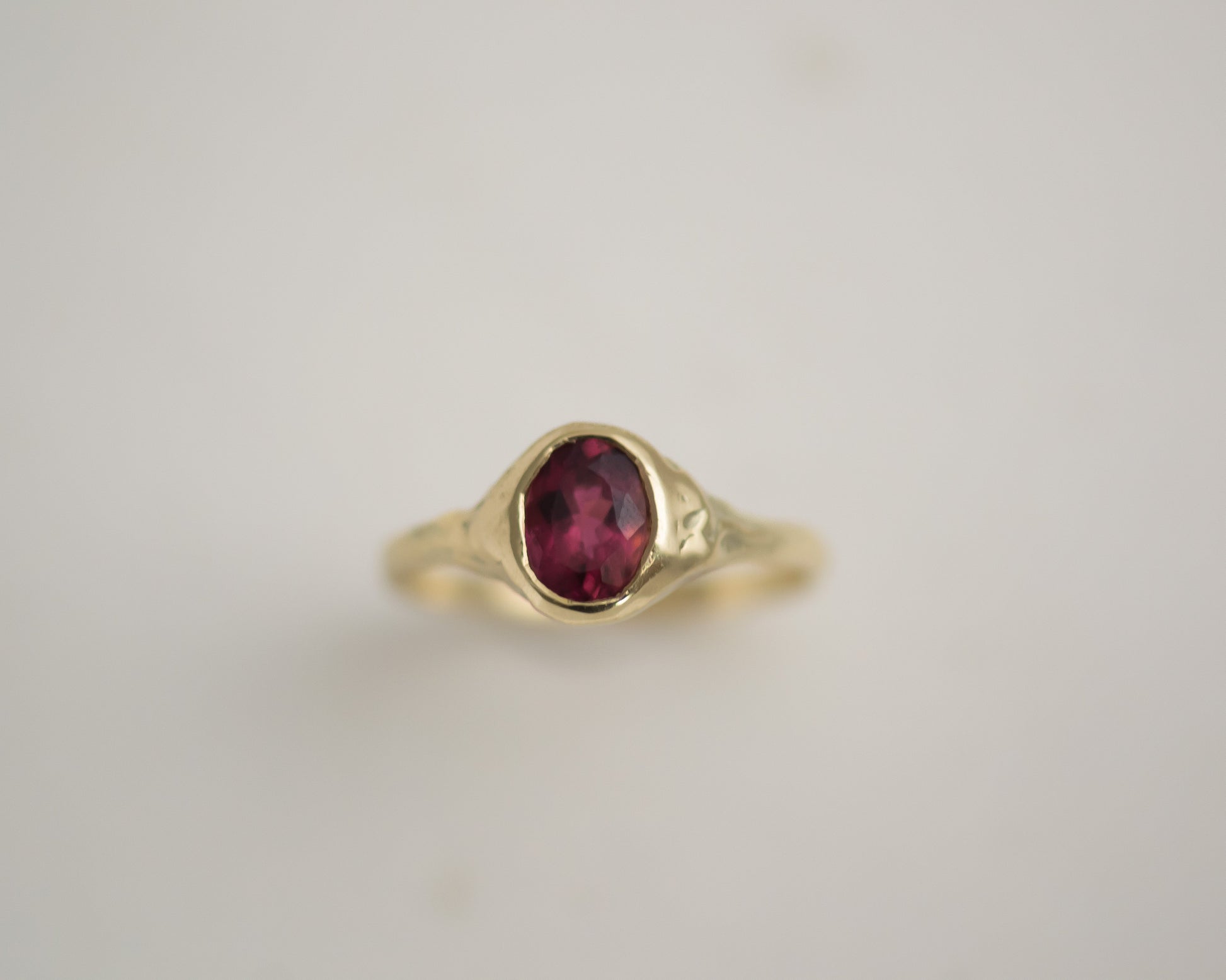 Hand carved in wax, then cast in solid 14k gold. The ring is made with an oval pink tourmaline. The pink tourmaline sparkles so pretty indoors and in sung light, even looks like a ruby.